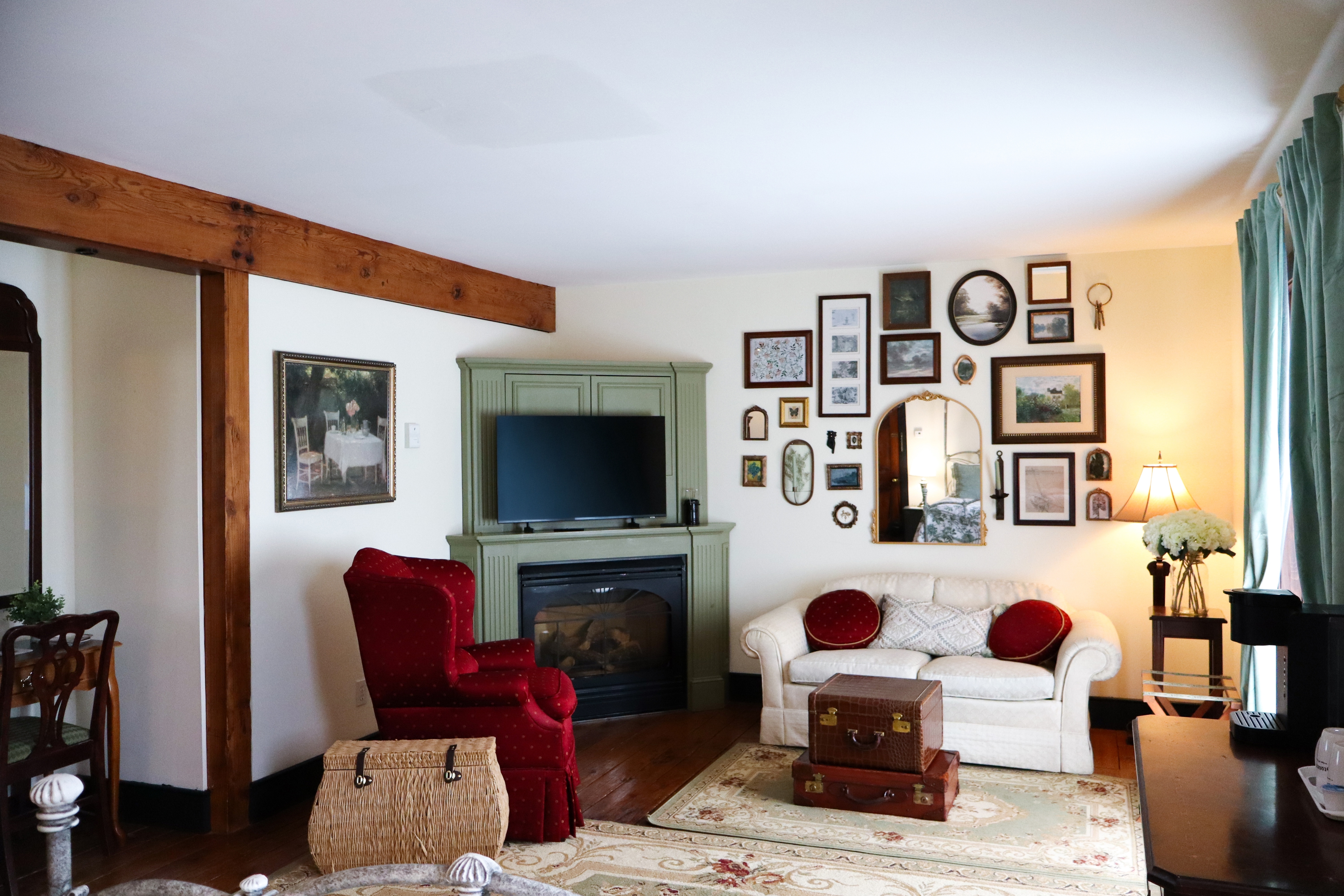 The spacious sitting area features a comfortable seating, a gas fireplace, a writing desk, and a flat-screen TV with streaming, along with complimentary Wi-Fi. A double armoire and richly painted dresser offer ample storage for your stay.